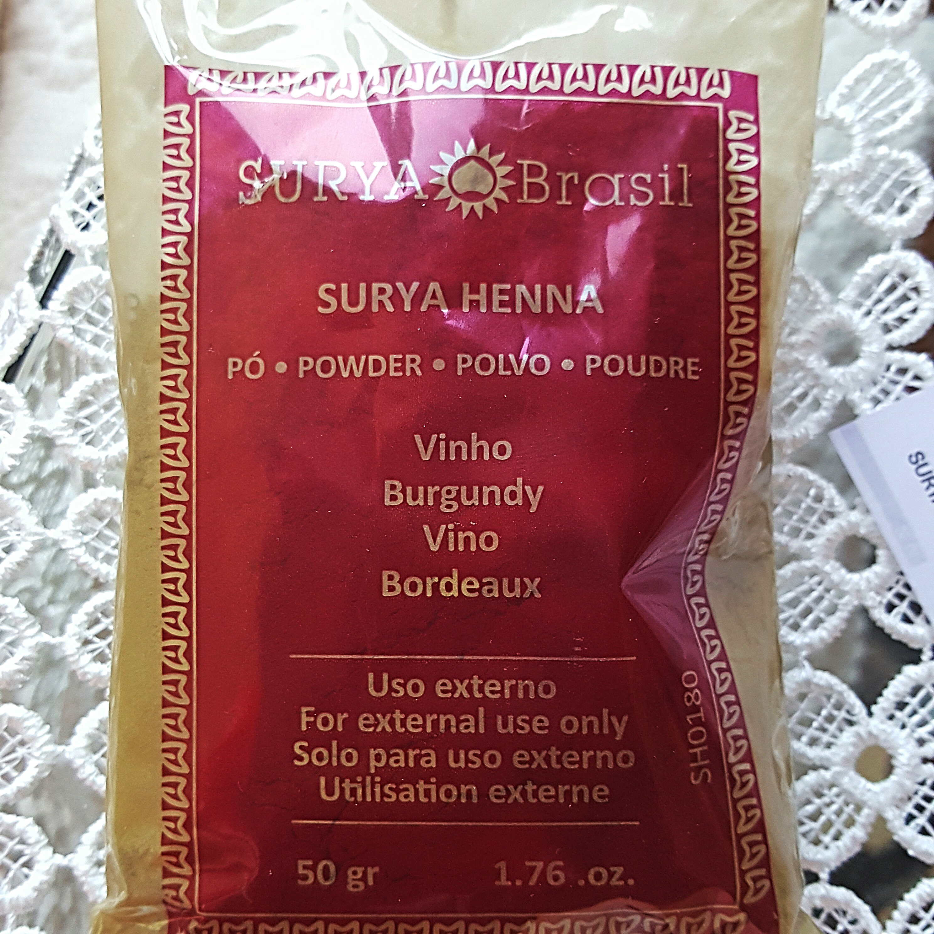 Una versione molto simile è rappresentata dall’azienda Surya Brasil, che tra l’altro ho visto anche nell’organic shop dove vado spesso dalle mie parti, Panacea a Nord di Londra. Ho acquistato la versione in polvere da 50g nella colorazione Burgundy su Amazon UK, di cui vi metto il link qui. Ho controllato e si trova anche su Amazon IT, nel caso vi possa interessare. Vediamolo nei dettagli.